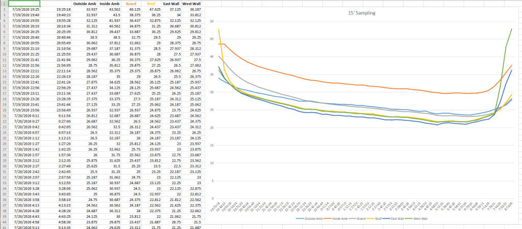 All wired up and gathering data you can see the container cooling off over night and then heating back up very quickly as soon as the sun comes out. Stay Tuned for more data, more charts, and of course…More Questions!