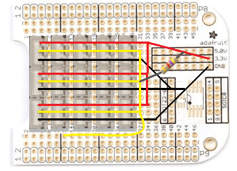 The back-plane wiring of my cape turned into a rat’s nest, but here’s a top down diagram for how I soldered each connector in parallel and then to its termination at ground, 3.3v, or data (pin 12).