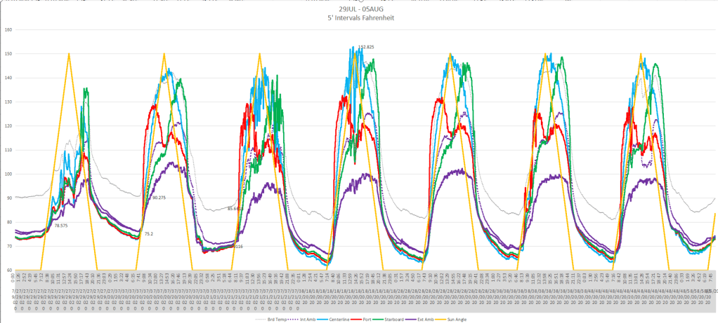 As you can see from the solid purple line, besides a slight dip on the 31st to a cool 97ish, the rest of the week stayed a balmy 99 to 105. Which was nothing compared to the 140 to 152 degrees the roof and West side walls felt.