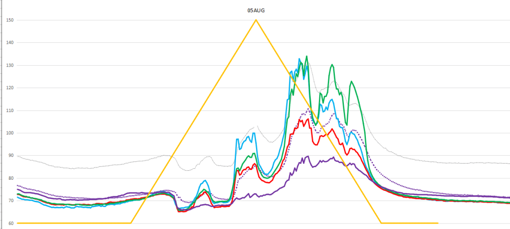 The chart above is titled thru the 5th but in reality it’s just until the start of the day. Here’s a zoomed in version of August 5th spread out horizontally to show us some detail. The morning started cloudy with a little rain but then the clouds cleared around noon with a few more coming in again just after 1300. Once those clouds left by 1400 the sun was back to full force and the 120 to 135 degree metal temperatures resumed.