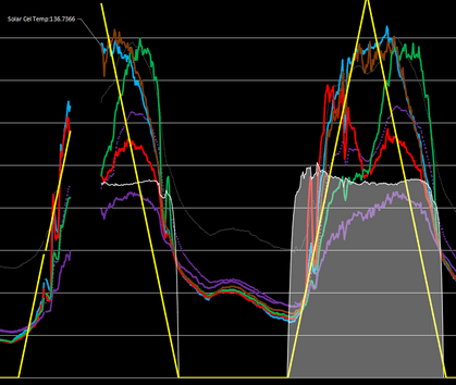 The white “butte” is a little more obvious in this chart starting off at approximately 105, dipping a little around the time the green temperature does, and then falling off completely, joining the yellow line of the sunset at the bottom of the chart. Notice the white line shooting back up right at sunrise on the next day? Monocrystalline, just like a light switch.