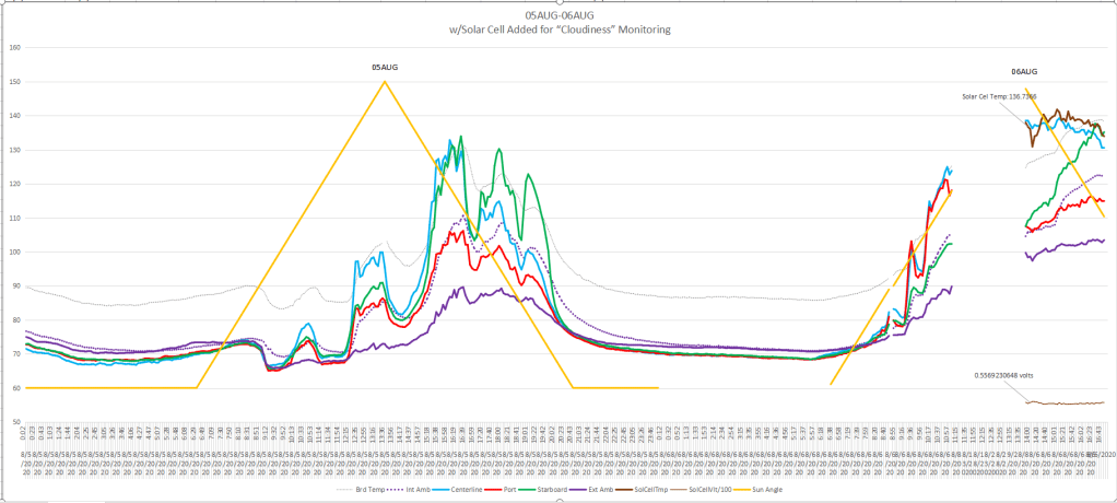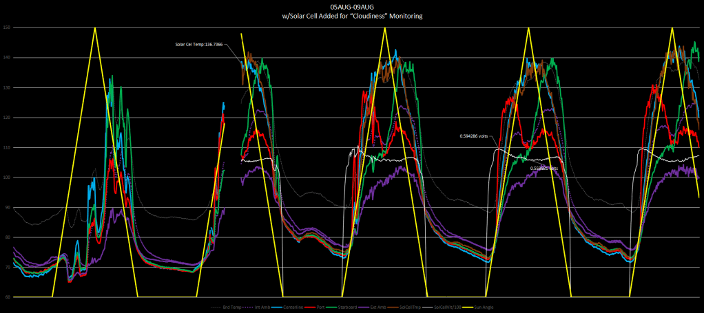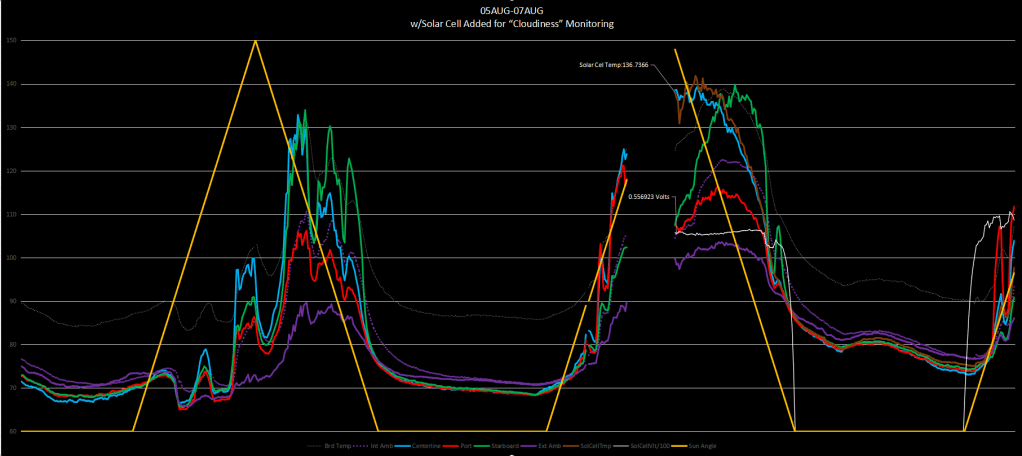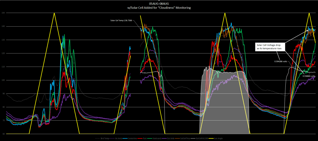 A few more days of data gathering and now the pattern is obvious. The solar cell voltage “sags” as its temperature rises throughout the day.