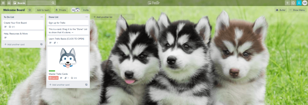 For most people starting out I recommend Trello.com. A simple, yet extremely effective, Team collaboration task manager. The basic version is still free. Tasks are created as “cards” on lists that you can drag from one status (To-Do) to another (Done). You can even create your own lists depending on the workflow used for the process you’re running. For example, a construction business might use lists (columns) like To-Do, Purchase Supplies, Gather Tools, Perform Task, Ready for Inspection, and Done. But it’s totally customizable and yes, you can change the background to whatever you want. The puppies are just a default as Trello’s logo and mascot is a Husky.