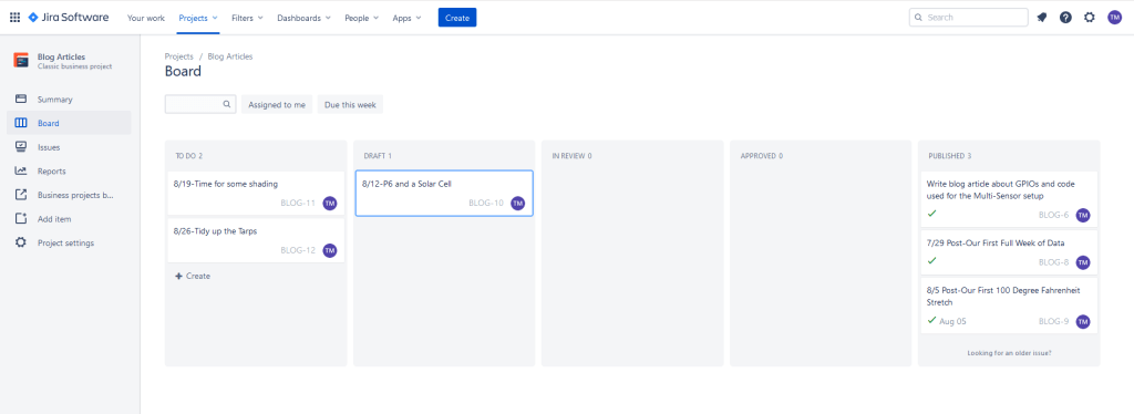 What makes Jira better than Trello in my opinion is its ability to create separate specific projects from templates depending on the type of project. It’s turn-key and you can be up and running in literally 15 minutes. I even have a Blog Project for tracking what blog articles I plan on writing, what I need to do to get all the content I need for them (sub-tasks), and a workflow to track and manage their progress.