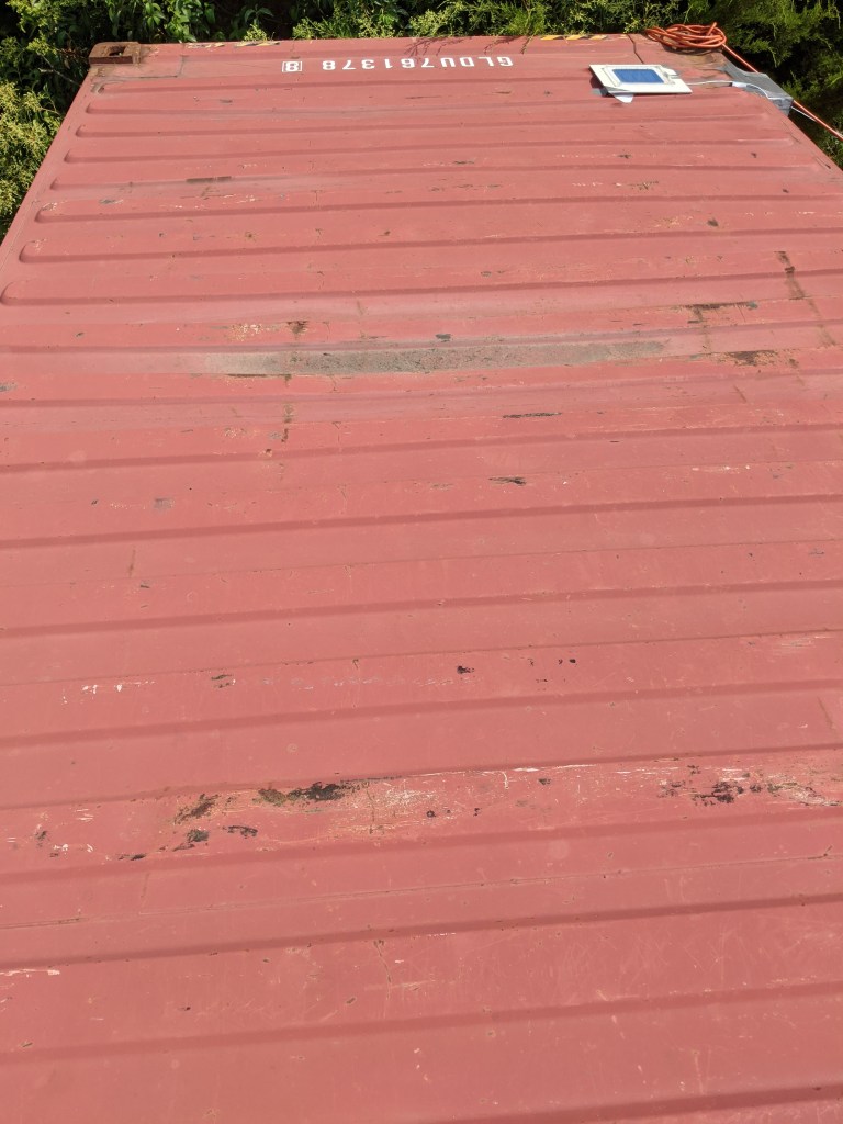 We mounted the tile to the top of the container near the openings where all the other wires went in. Straddling the ridges in the container roof we had hoped to provide some ventilation for the temperature sensor underneath the tile. Sadly, the sensor received heat from the solar cell heated tile AND the metal roof. We’ll have to move the cell or put it on a pole or something.