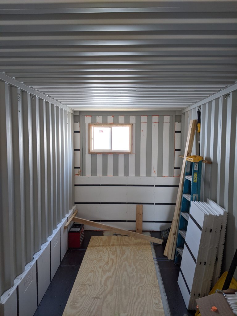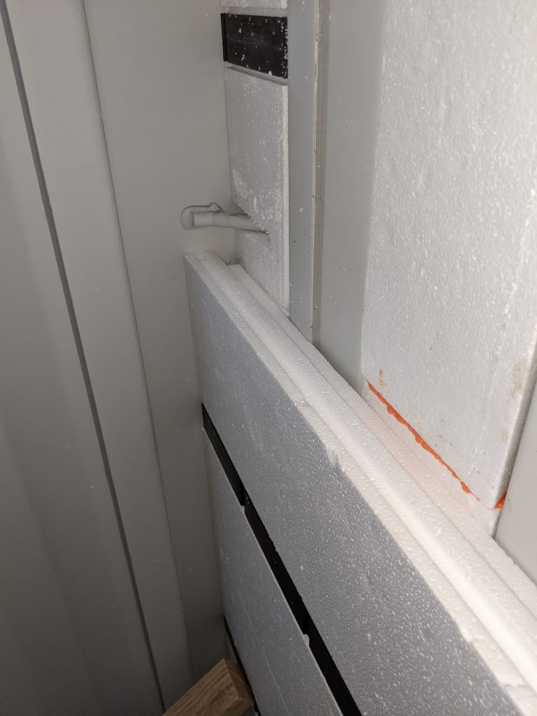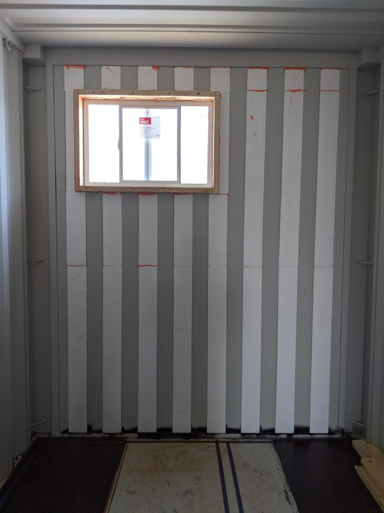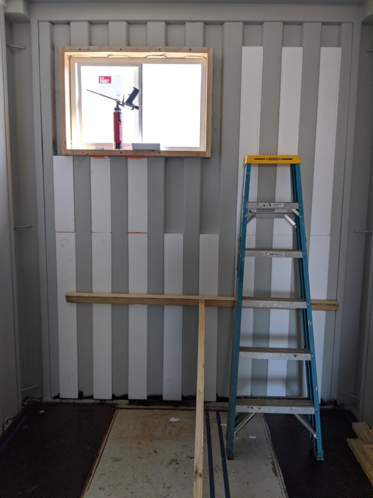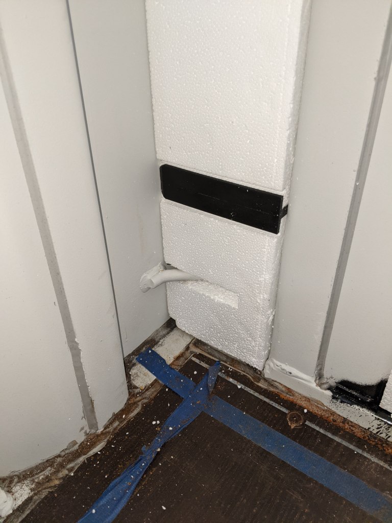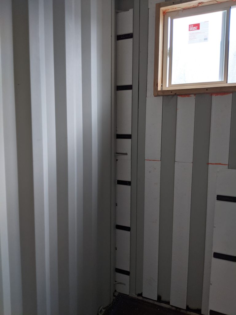 A picture’s worth a thousand words so here’s how the end wall (bathroom) came together. Pay close attention to the tools you’ll need to get your pieces just right so you get a snug and flush/flat installation. After all, these panels are both your insulation and your wall’s studs. In the end, the goal is “No Exposed Metal”. Don’t believe me? Leave a window open over night and check out what a morning dew looks like when humid air condensates on cold steel. It looks like horizontal rows of drippings the entire length of the container. Enough to soak up several towels. So yes, take insulation and sealing off the metal as serious as you can.