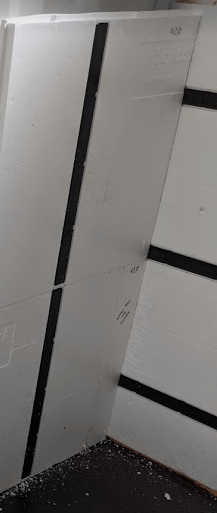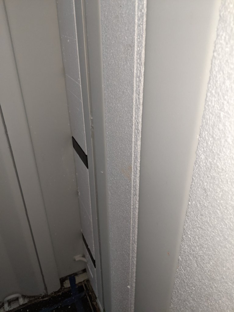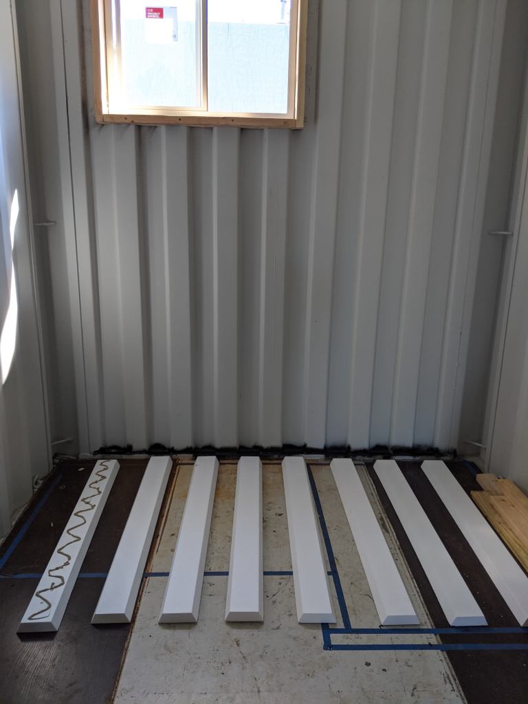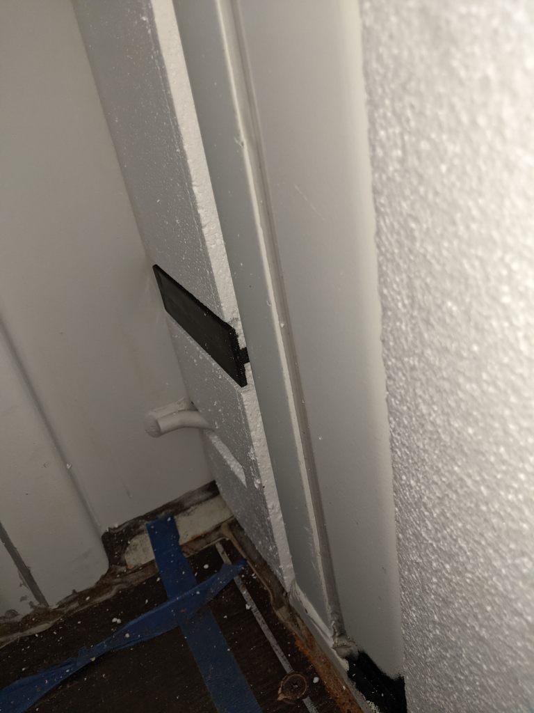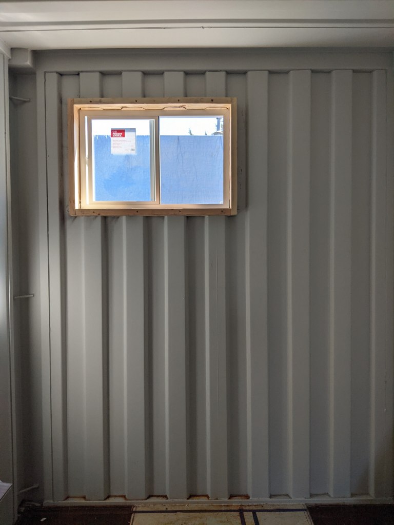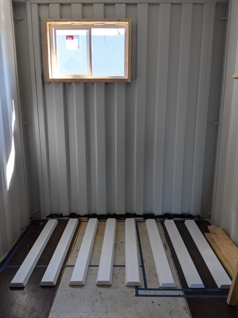 A picture’s worth a thousand words so here’s how the end wall (bathroom) came together. Pay close attention to the tools you’ll need to get your pieces just right so you get a snug and flush/flat installation. After all, these panels are both your insulation and your wall’s studs. In the end, the goal is “No Exposed Metal”. Don’t believe me? Leave a window open over night and check out what a morning dew looks like when humid air condensates on cold steel. It looks like horizontal rows of drippings the entire length of the container. Enough to soak up several towels. So yes, take insulation and sealing off the metal as serious as you can.