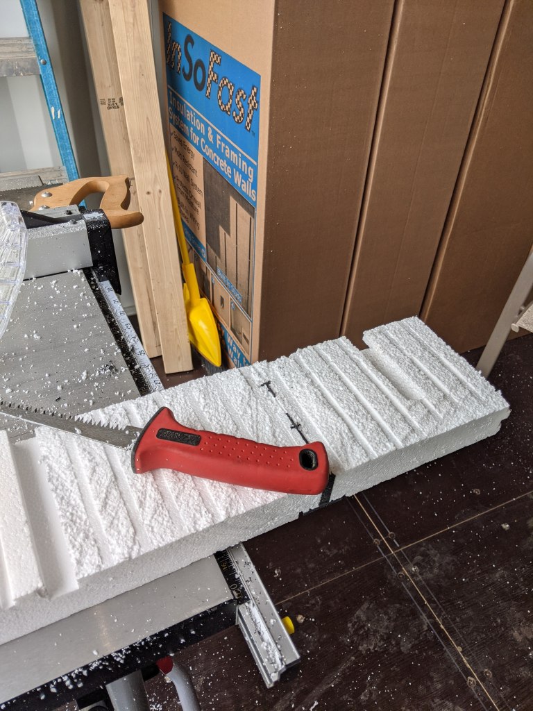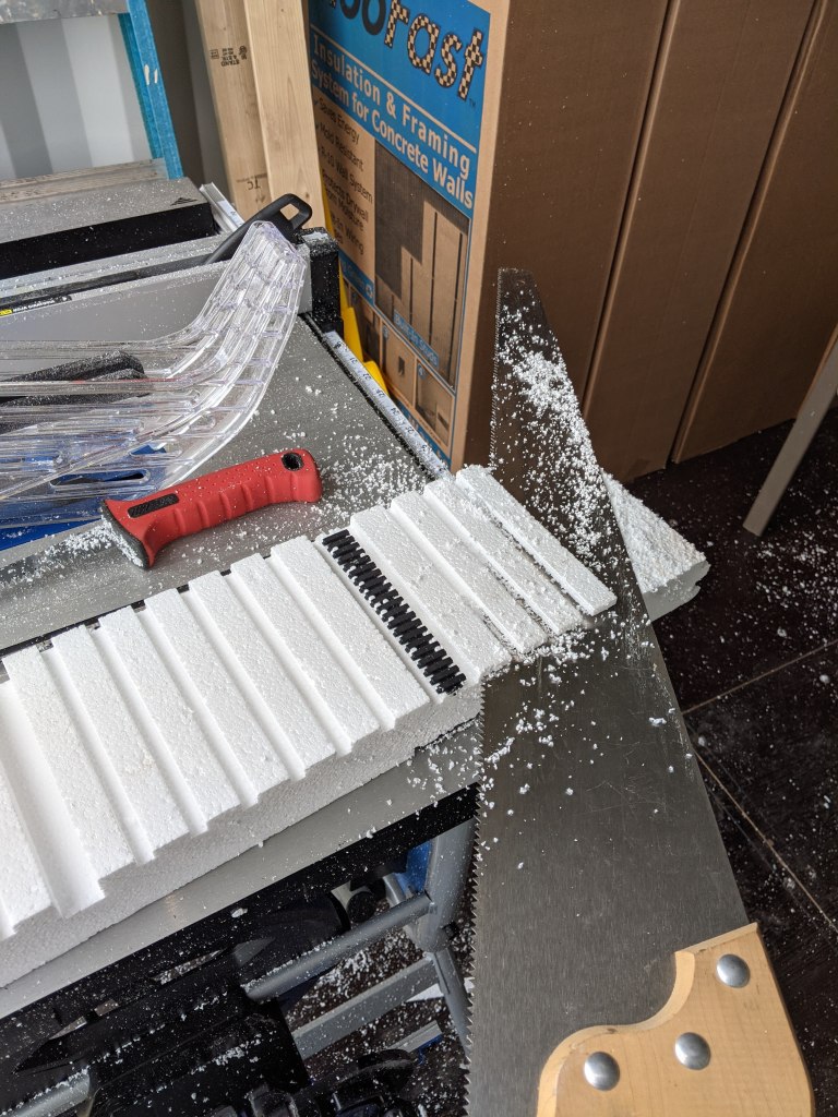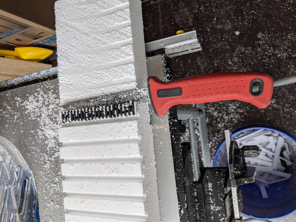A big flat blade is best for the closed cell foam while the drywall saw is great for the “comb” side of the plastic stud.