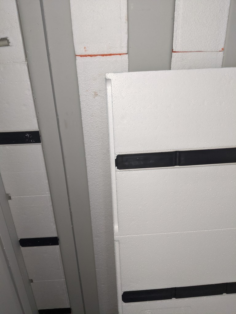 This is where having a sanding block to notch in the insulation a bit will help it fit flush. I couldn’t get a good pic of it but imagine shaving about 1/4″ from the backside about 6 inches from the left corner all the way down. Cutting a short piece of the “comb” just in the corner was also necessary and the gap just disappears.