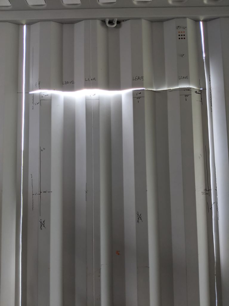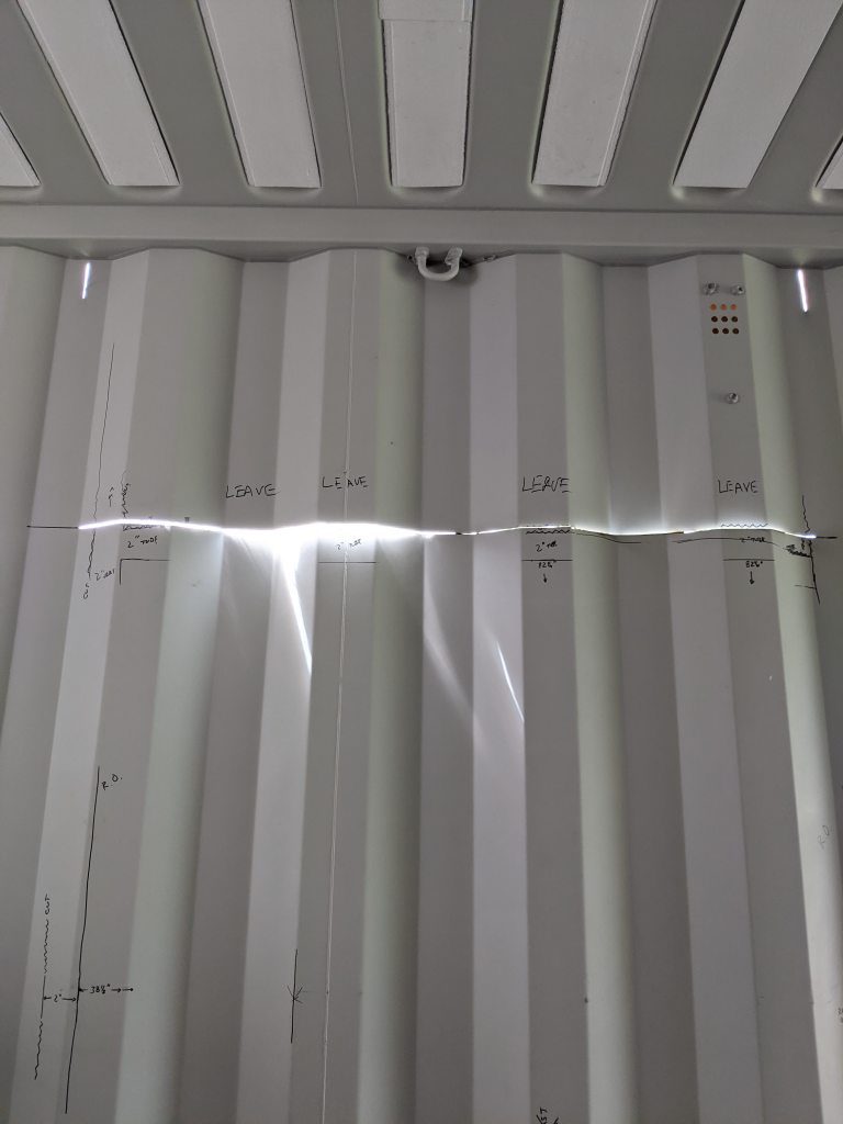 I know I said no more cuts for awhile but it occurred to us, if we’re going to keep this thing modular and add a second container down the road (soon) we shouldn’t install insulation, expensive InSoFast insulation, just to rip it out in just a few months.