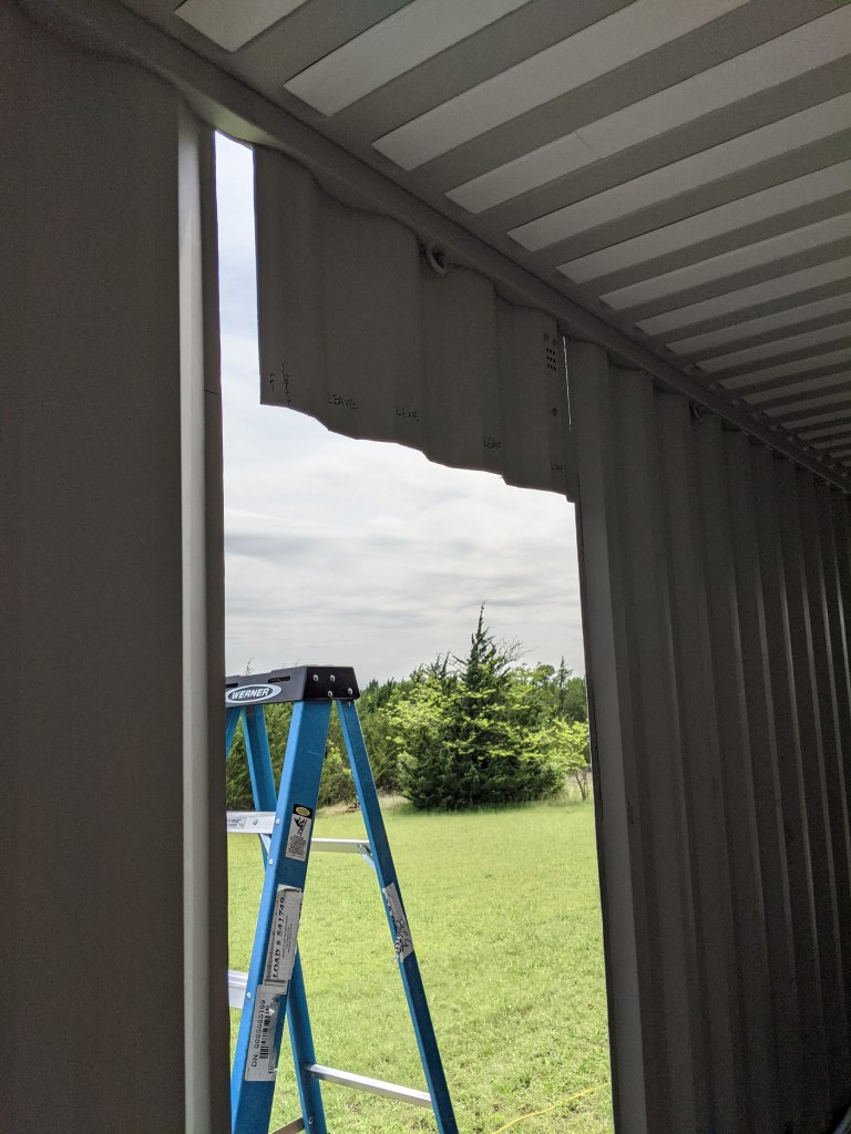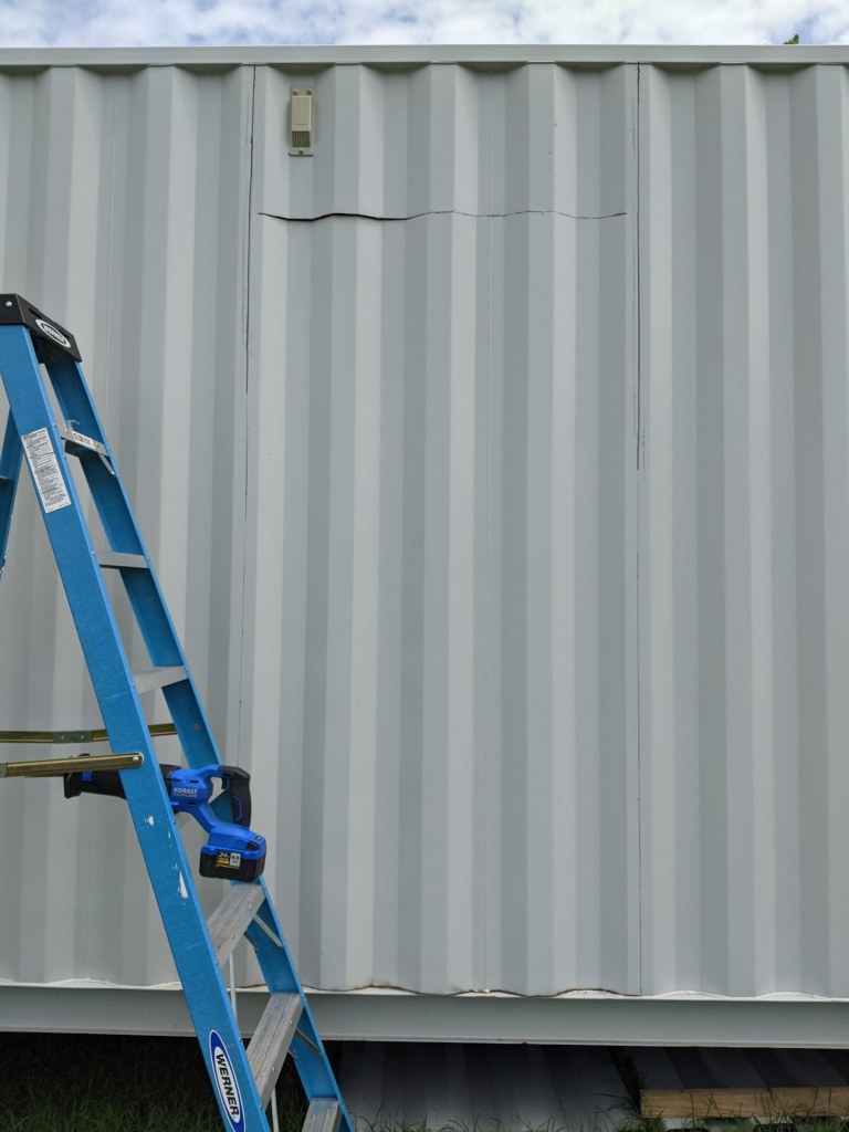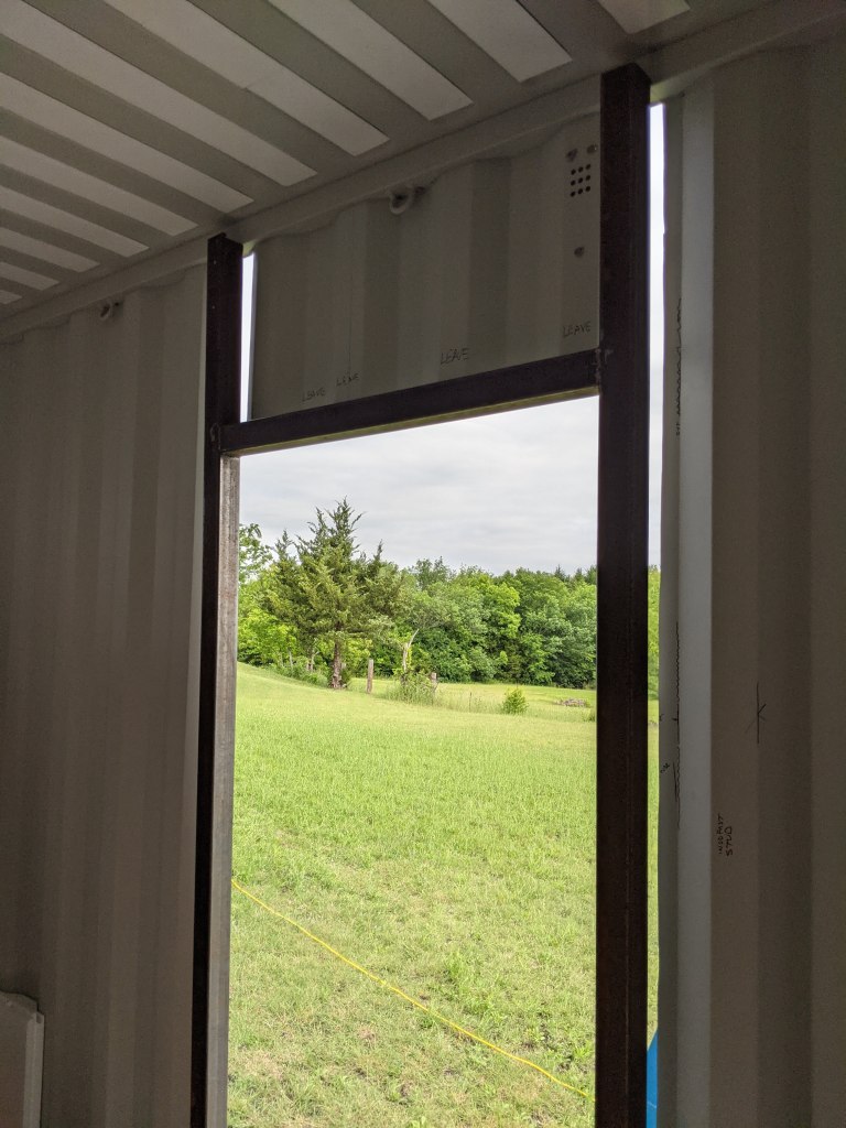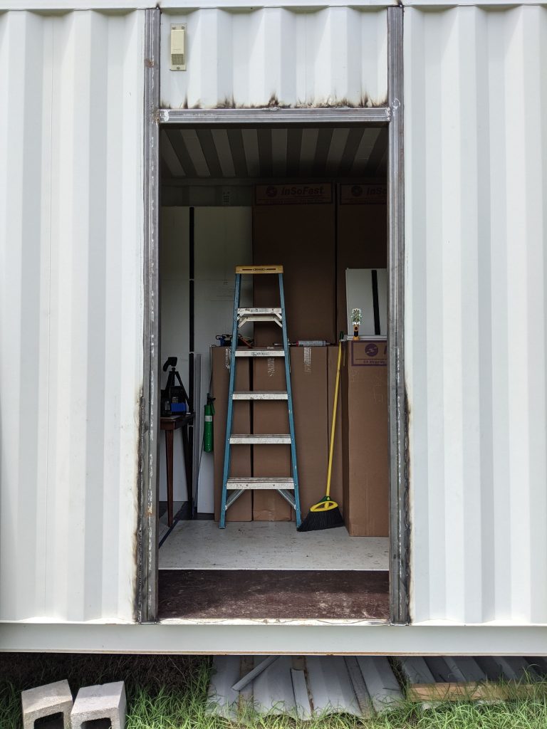 - Cut the door way, install the door frame, install an exterior door, and build it so it can be removed in the future after the second container is added and a barn door slider is install in the bathroom.