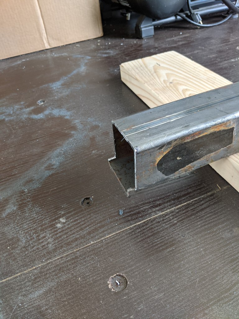 The following image isn’t the final for the “notch”, I still had to cut/grind the remaining bits so that only a flat lip remained. With this notch cut, the size of the 2.5″ square tubing comes out to be flush to the outside of the container top and bottom rail beams.