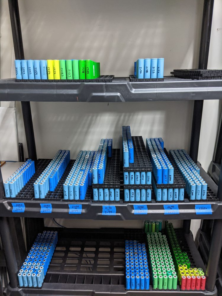 That middle row alone is about 800+ cells ranging from 2000mAh to 2300mAh. We have approximately 400 more awaiting leak testing and another 400 that need to be shucked.