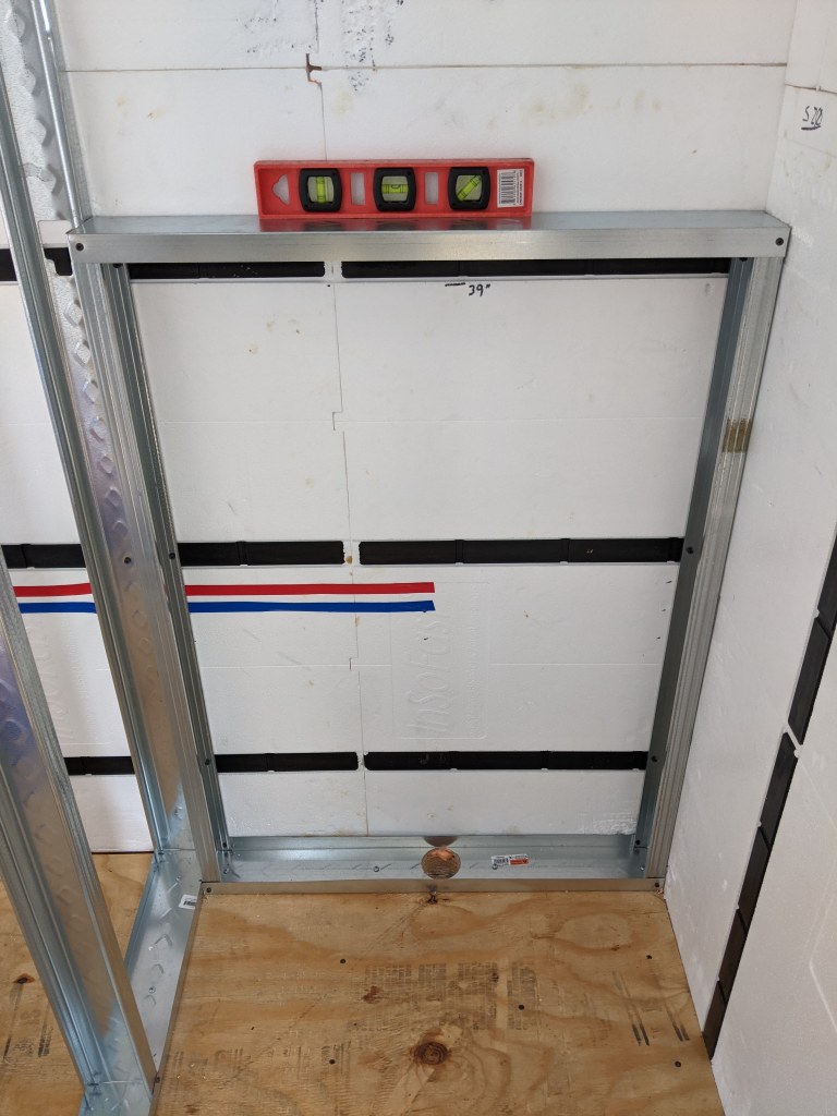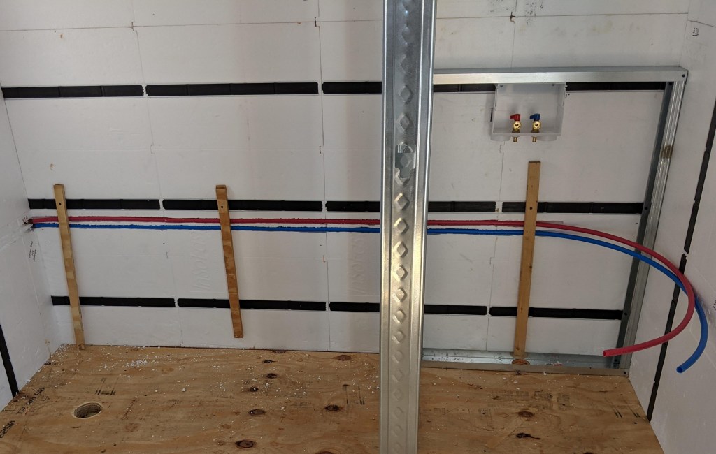 In our case, we opted to build out a “box” where the washing machine valves and stand pipe drain could go along with our hot and cold water manifold. This would be where everything comes together. The main water line and on-demand hot water heater would be mounted on the opposite side of this wall just outside.
