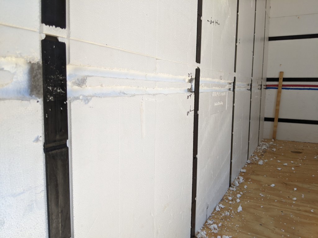 Using an exacto knife and a straight edge we cut the top of the trench line first. Then plunge the hot iron, hook up, to the desired depth and dragged it along the tape or pencil line created earlier. It’s slow going but you’ll get the hang of it pretty quick. When you reach the end of the line, pull the iron out and the cut-out can be easily removed with your fingers or needle nose pliers. Remove the foam from behind the studs and be sure to check that your lines can pass straight through before you run each length. Use a scrap piece of PEX to check these pass-thrus.