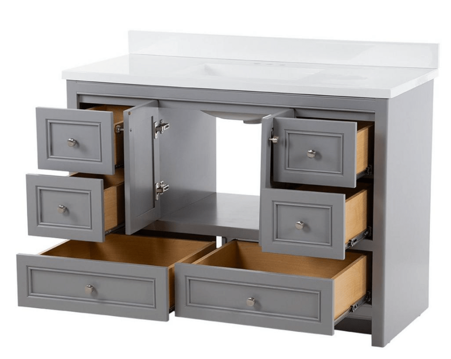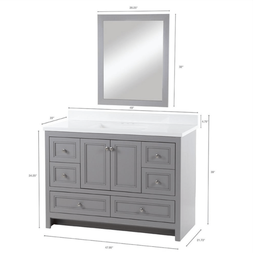 After keeping an eye out for deals we found one that included the sink, the counter and back splash, and even a mirror. And the dimensions were perfect too.