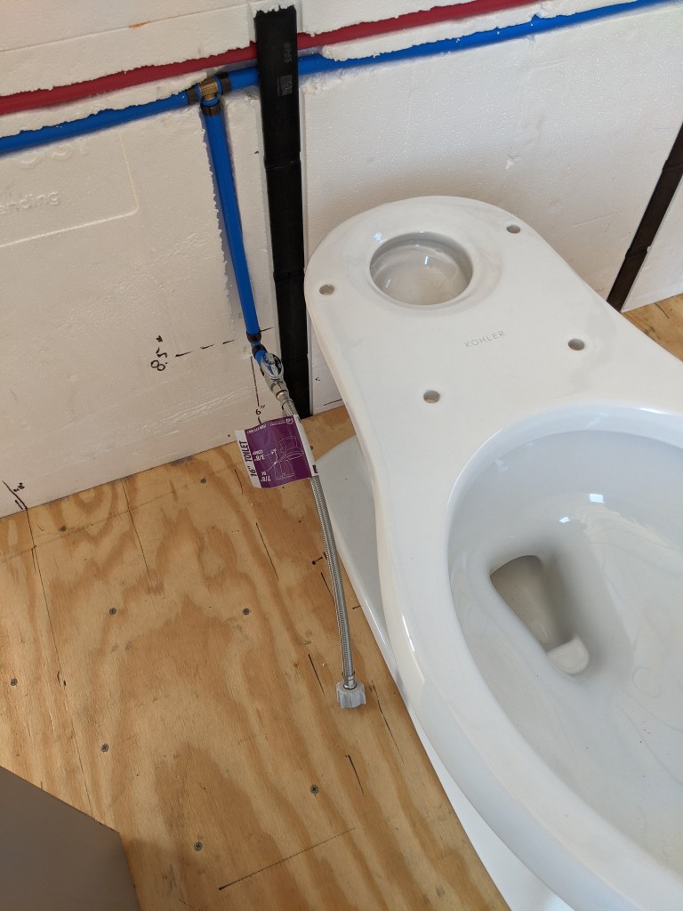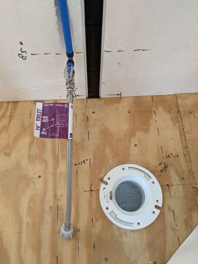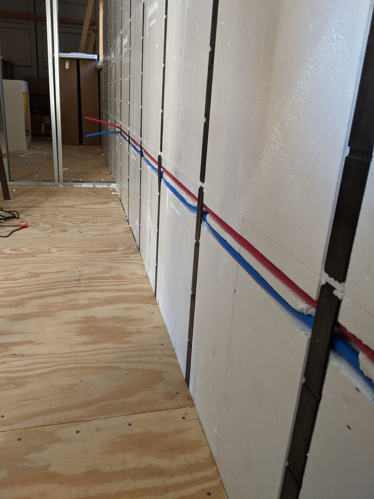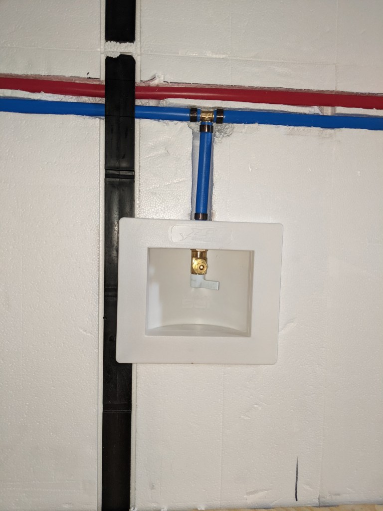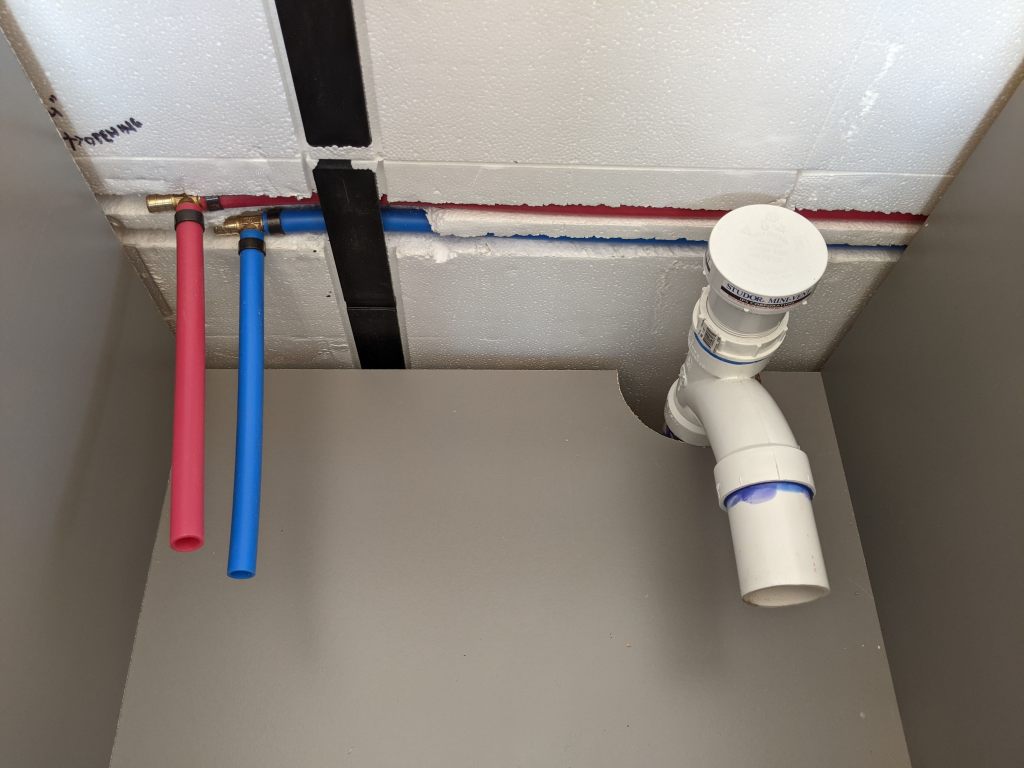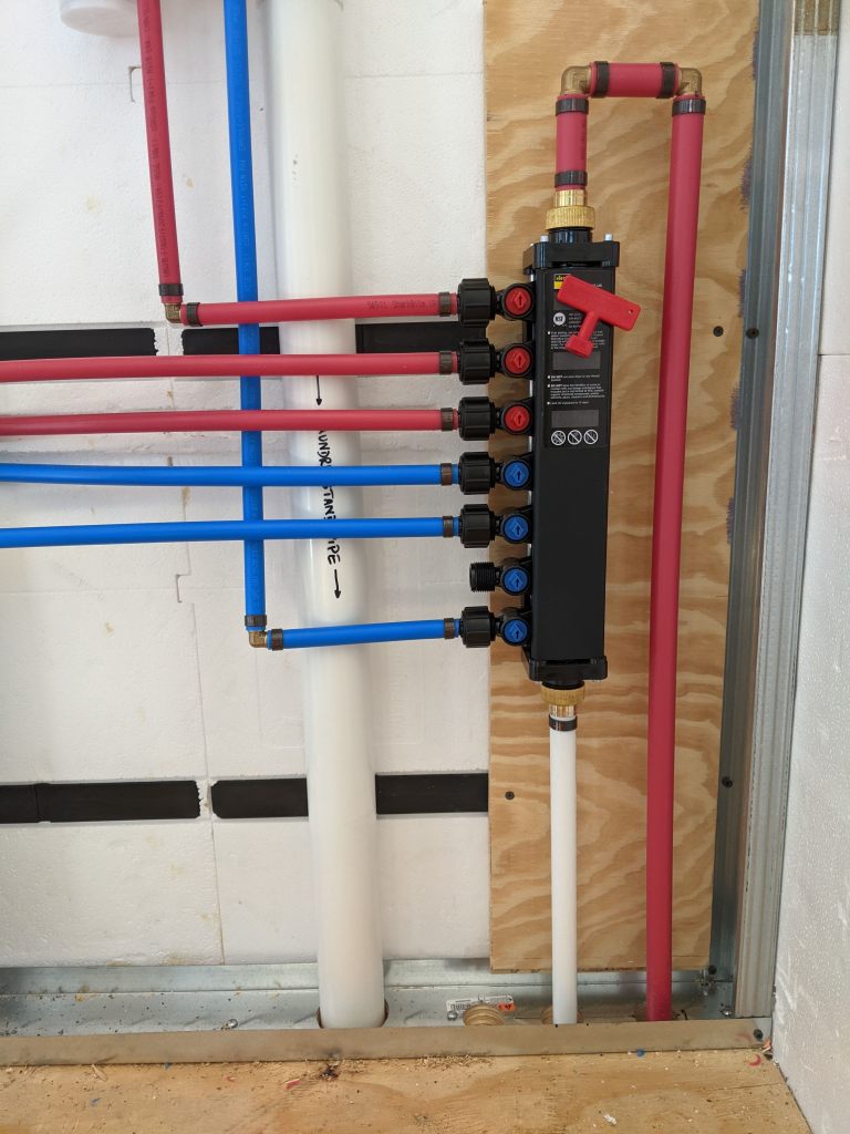 Once we’ve verified water supply (with no leaks) to the manifold we can complete each home run and test each of those too. At least for the cold side. Once the water heater is installed, we can test the hot sides.