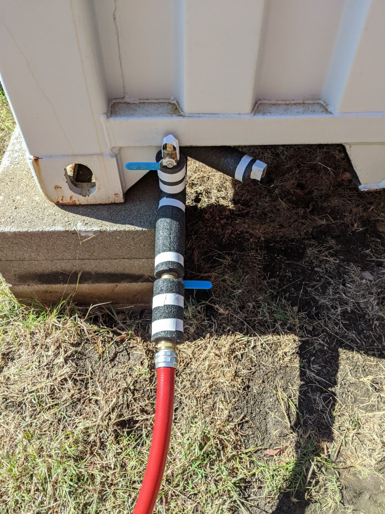 A temporary setup out side and we can begin our test. Later we’ll need to fabricate the structure that will hold and protect the piping and the water heater.