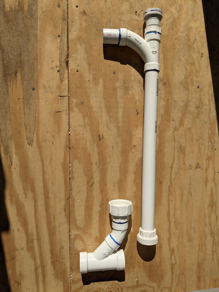Code allows for an AAV (Air Admittance Valve) instead of a vertical vent pipe that goes all the way up to the roof. As long as we have good air flow into our “air-tight” container, these are allowed. Here we used a Studor Mini-Vent.