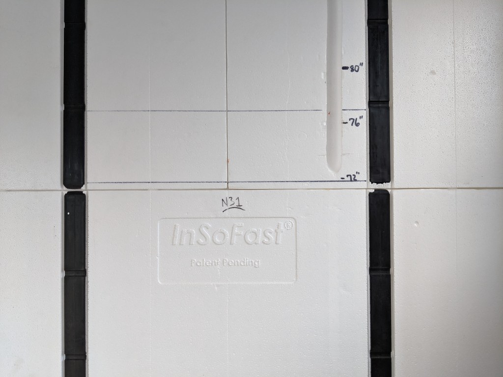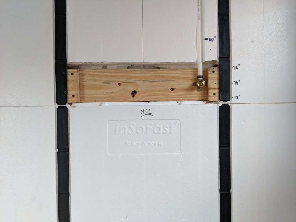 Pulling lengths of Pex through those plastic “studs” in the InSoFast was NOT an easy task. And once you have 3 to 4 sections of Pex in the wall you can’t just yank on one end and it slides right along. Ney Ney. You have to “inch-worm” two sections of slack down the wall, and then go back to the supply end and do it again, and again, and again. We almost crimped (dented) the Pex once or twice using this technique. The lines tend to pinch at the studs because it’s not a straight thru and having both lines go through one hole in the stud is just too tight.