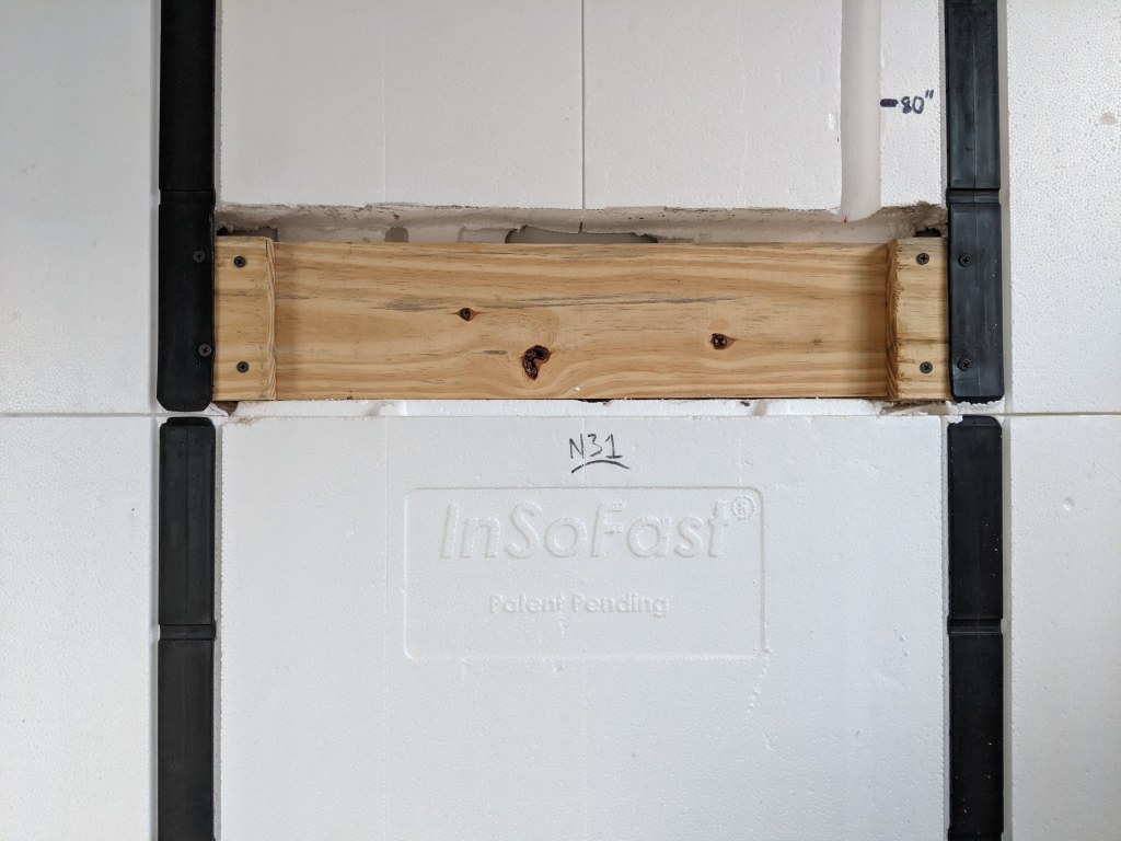 If this were a stick-built house with standard wall depths I’d just stick a 2×4 between the studs and mount my hardware on that. In this case I had to create a cavity for this structural component and shallow enough to make it flush with the wall without removing the insulation all the way to the outer metal wall.