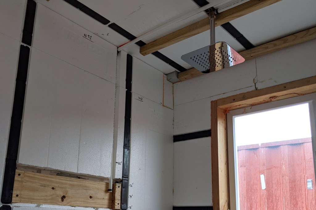 Once everything has been leak tested and the rain shower head idea is finalized I’ll insulate everything and put those pics up too. In the meantime, here’s how everything is currently. I have a feeling I’m going to be changing it because we won’t want to have both running at the same time. Maybe a 2-way valve before the main shower head arm and a return line that goes back up to the rain head? Who knows.