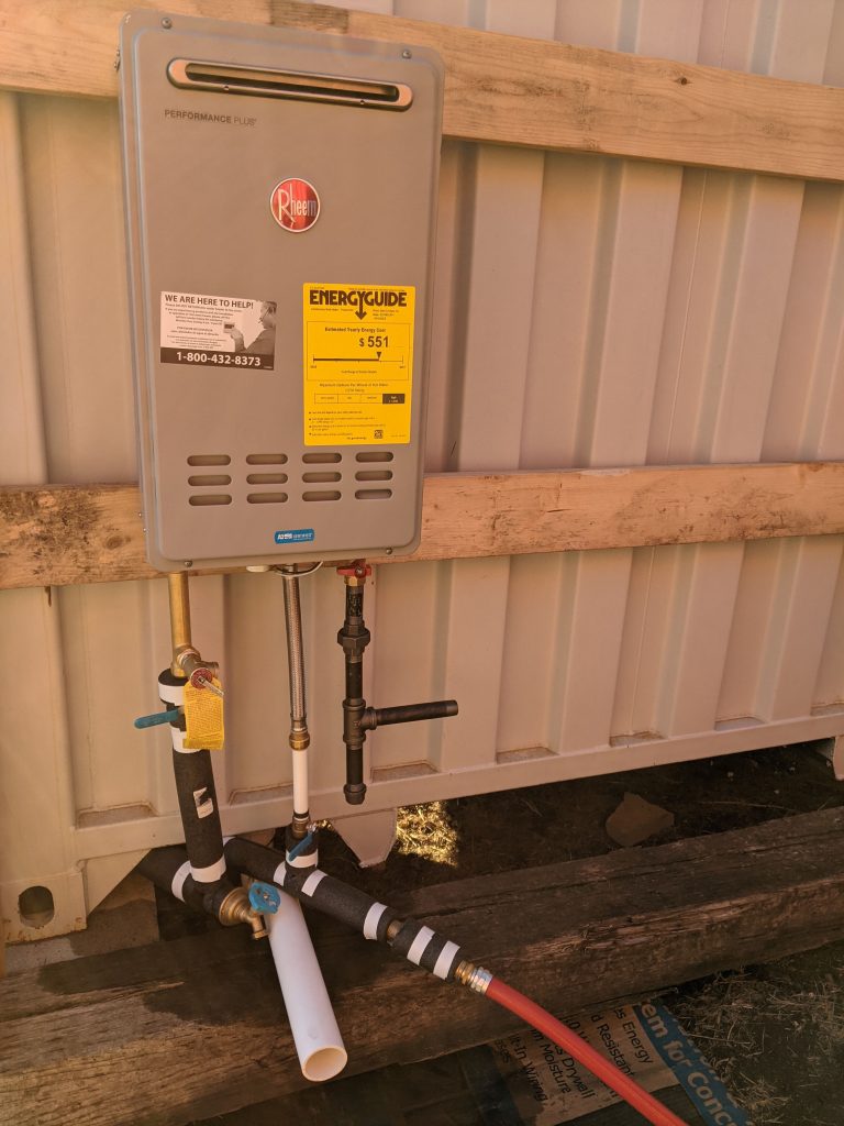 The CBP is modular, can be assembled by one person, mounts securely to the container without welding, and protects/hides all of your piping and equipment from the elements…even though it’s all rated for outdoor use. The CBP still provides adequate, yet separate, ventilation for the propane water heater, the solar inverter charger, and all of the supporting battery equipment like the BMS, or Battery Management System, hardware. You’ll never guess where the battery is going… π
