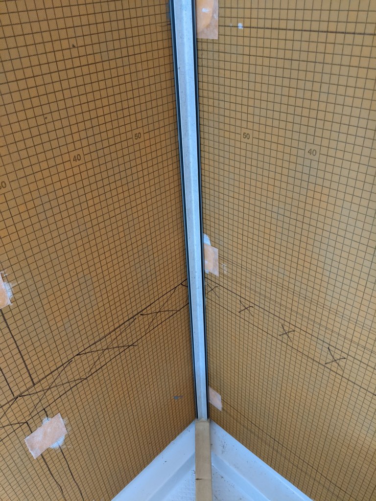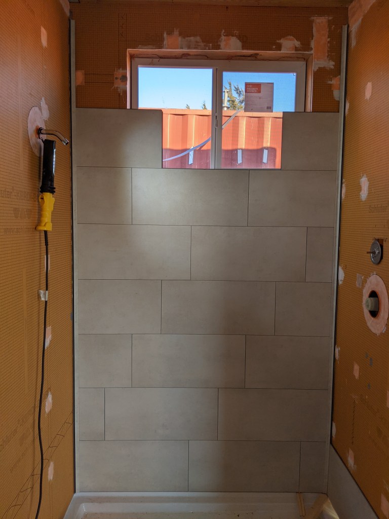 Luckily, because I hadn’t used the spray adhesive yet they were easy to remove and no damage was caused to the Kerdi Board. On a side note, tests on scrap Kerdi-Board with spray adhesive did hold very well, so the 10 boxes of these subway tiles will not go to waste and we will be installing them in kitchen as a backsplash.