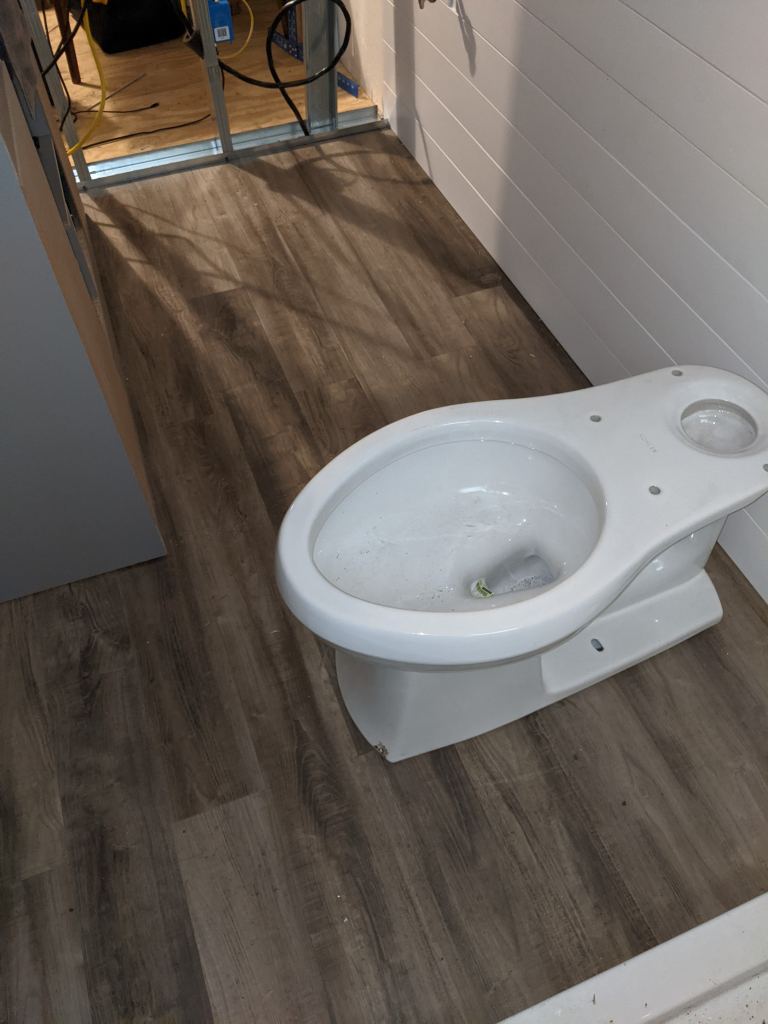 Between letting the glue set up and having days above 50 degrees that I could do jobs that require LocTite I found time to install some vinyl flooring in the bathroom. This product comes from Floor and Decor and was a breeze to cut and install. At $2.99/sq ft and waterproof this was a deal we couldn’t pass up. Since we installed this on an additional layer of fresh 5/8″ sub-floor AND since it comes with a natural cork backing layer, underlayment was optional. Note: If you plan on installing this product over concrete, an underlayment is required.