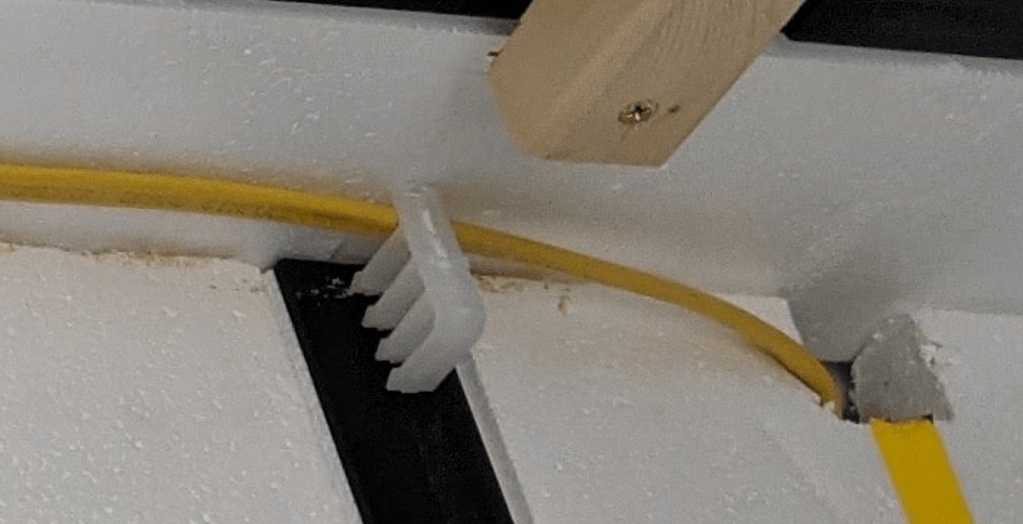 As for how to keep them neat at the ceiling it’s just a matter of repurposing some 3M Cable Stackers by cutting off the nail down bit. Slide the long tab above the wall panels and glue them into place.