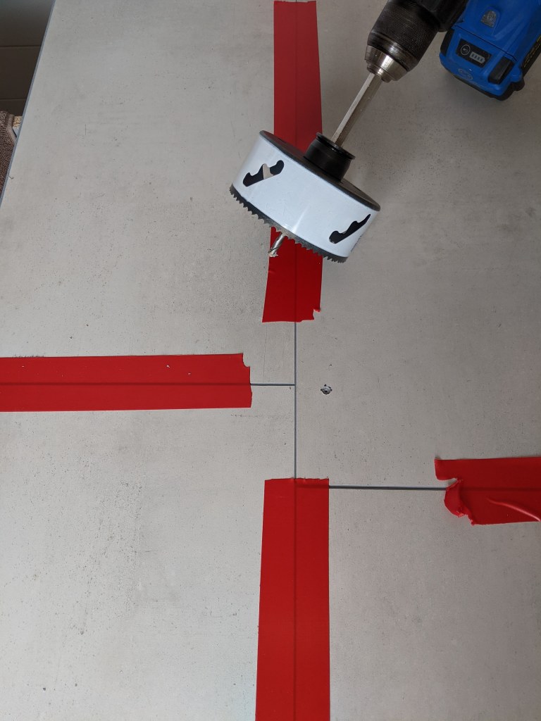 Lastly, reassemble all of the tiles on a flat surface, clicked together and flush like they would be on the wall then tape the seams together so they don’t move during drilling. Drill a small pilot hole for your hole saw(s). Lastly, since I had installed a 4.5″ Kerdi-board fixture gasket and a 3″ diverter valve I just used an appropriately sized hole saw to make my cuts. And viola’…
