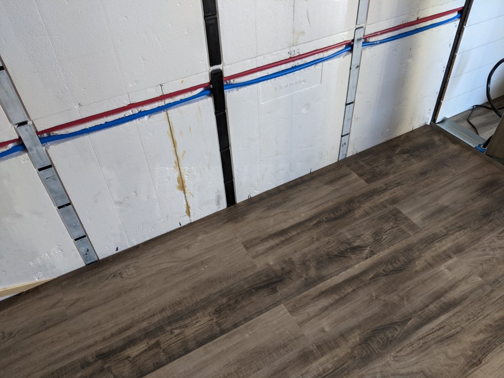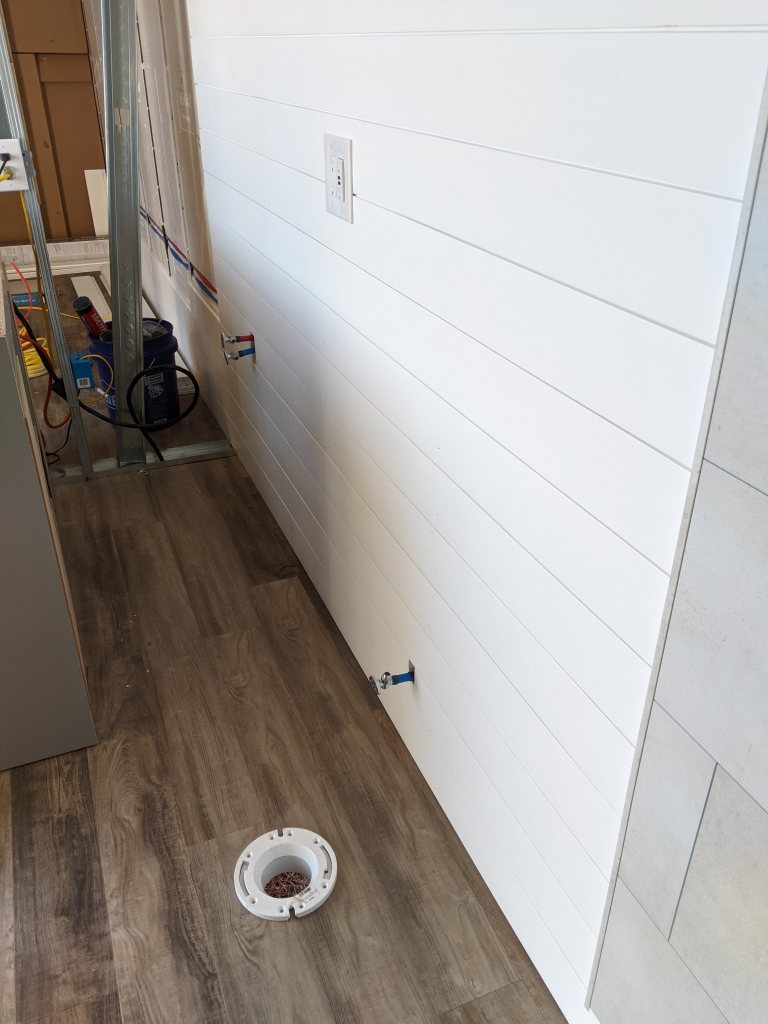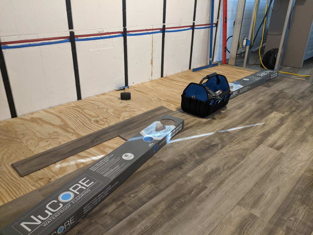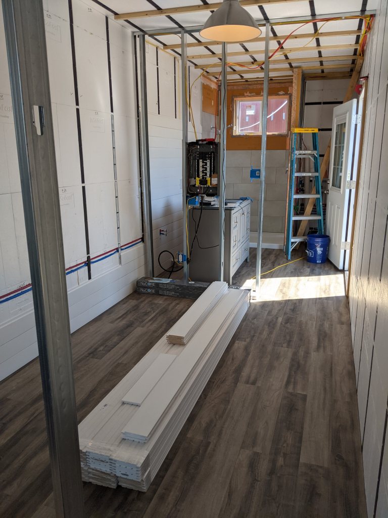 In order to do the dividing wall between the bedroom and the bathroom, all the shiplap has to be up first. And in order for the shiplap to be installed on that wall, the flooring has to be installed up to it first so the shiplap has something to rest on.