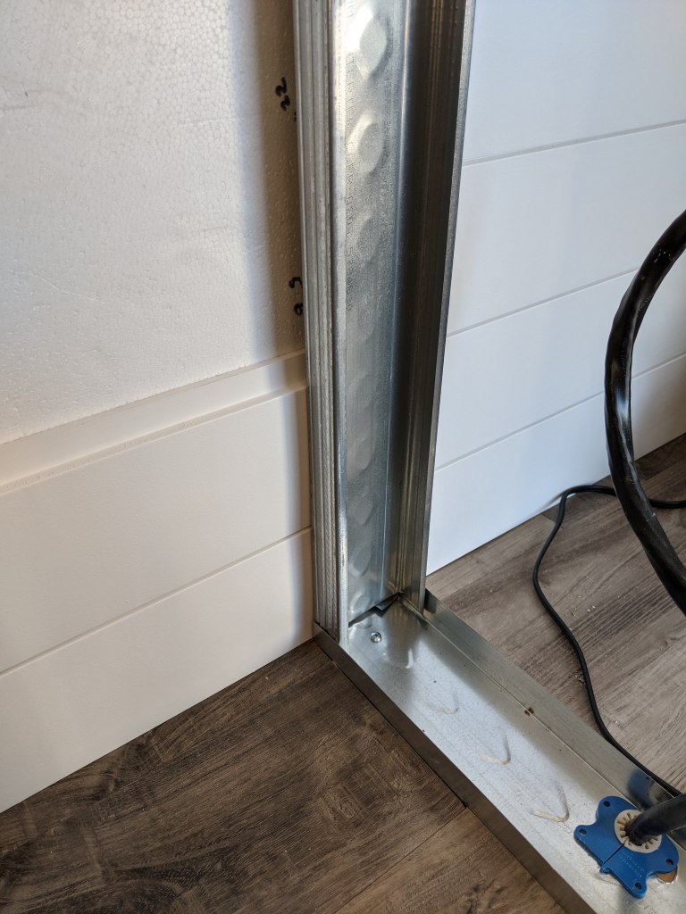 Once the entire shiplap wall is done this steel stud can be fastened to the wall with a wood screw through a pre-drilled pilot hole. Then the separating wall will have a point that is flush to the wall where shiplap can be anchored to it as well. This trick saves an extra stud and/or framing material.