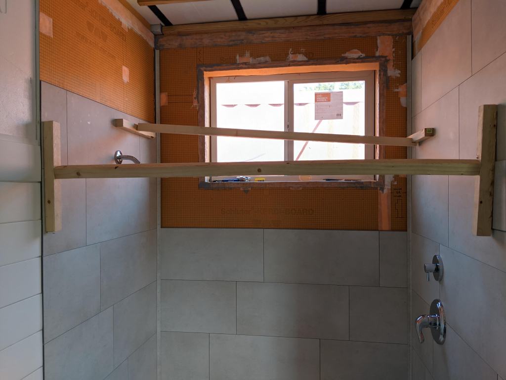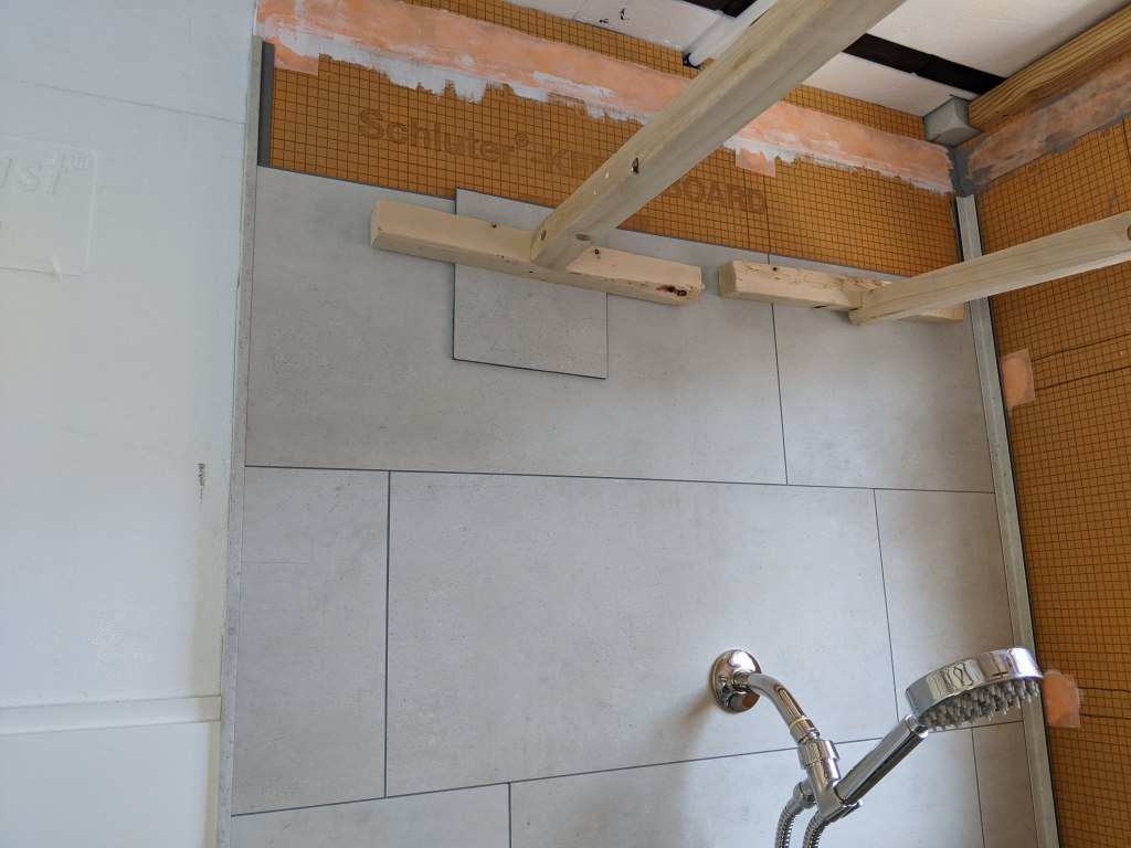 Another trick we found was to fashion braces to make sure the tiles don’t pull away from the Kerdi-Board. Because if/when they do, the LocTite will pool at the bottom, forcing the tile away from the wall at the top, and this creates a wedge that’s almost impossible to remove without doing damage to the tile or the wall. Trust Me!