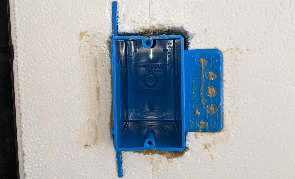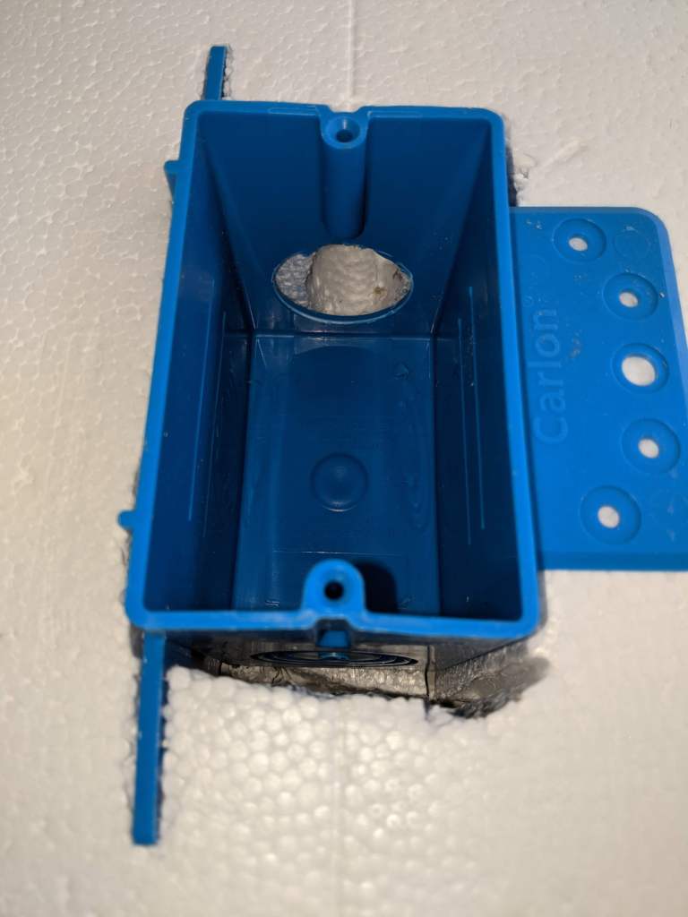 - There’s no nailing of the electrical boxes, only adhesive, unless you luck out and get a stud right next to your insulation cut out