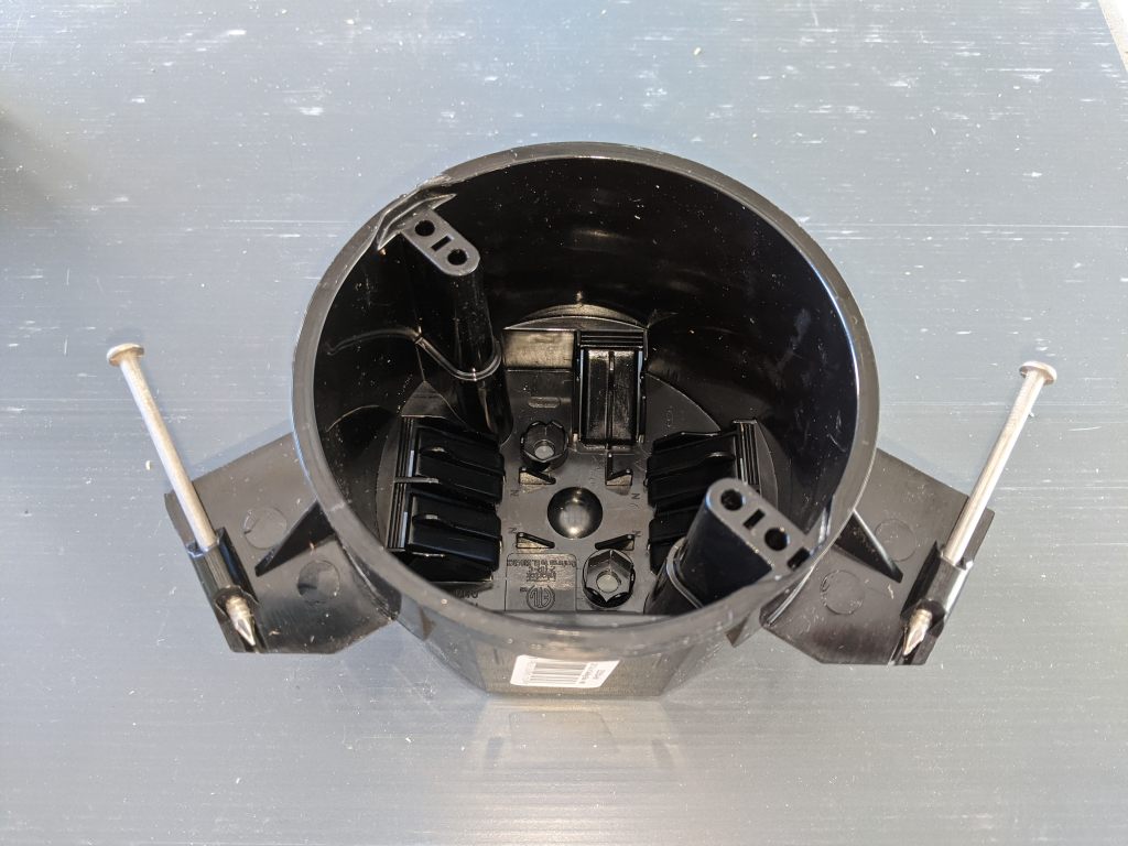 A few things to take into consideration. 1) The round box slants inwards to the back, so we used a shim to square it to the pine wood, cut off any excess; 2) The lip at the bottom of the box is usually on the outside a stud so drywall can be installed around it giving it the right depth; in our case we used the top of a scrap piece of shiplap board for this lip. 3) We cut the pine 2×2 the right width so we could finish nail it through the shiplap board giving us the vertical strength a light may need.