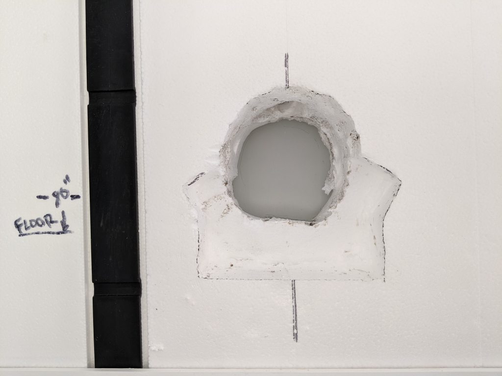 The large punch out will be required to reach the InSoFast conduit hole toward the back of the panel. Even so, you’ll need to carve out a lip with your hot knife to make it line up with the electrical box.
