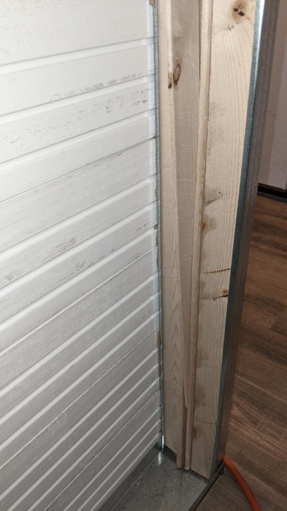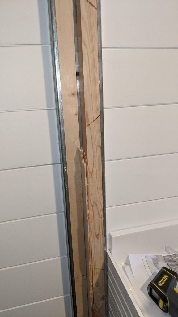 The trick is creating wood for your finishing nails to anchor to without filling the wall with wood. By running 8 foot lengths of 2×2 pine thru the table saw we were able to trim them down so that two could fit under the lip of the metal studs. Wedge spare pieces of wood between the two and your nail won’t push them away from the metal stud cavity when you send the nail into your shiplap. As you can see in this picture I just wedged giant piece of scrap, but before we seal up the other side of the wall completely, I’ll just cut some small 4 inch strips placed every couple of feet.