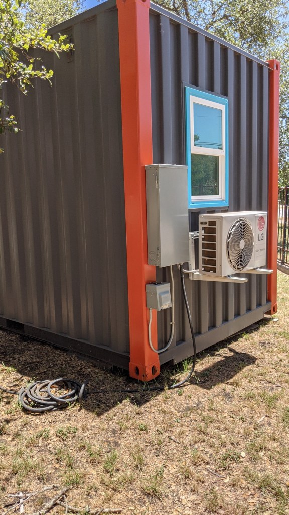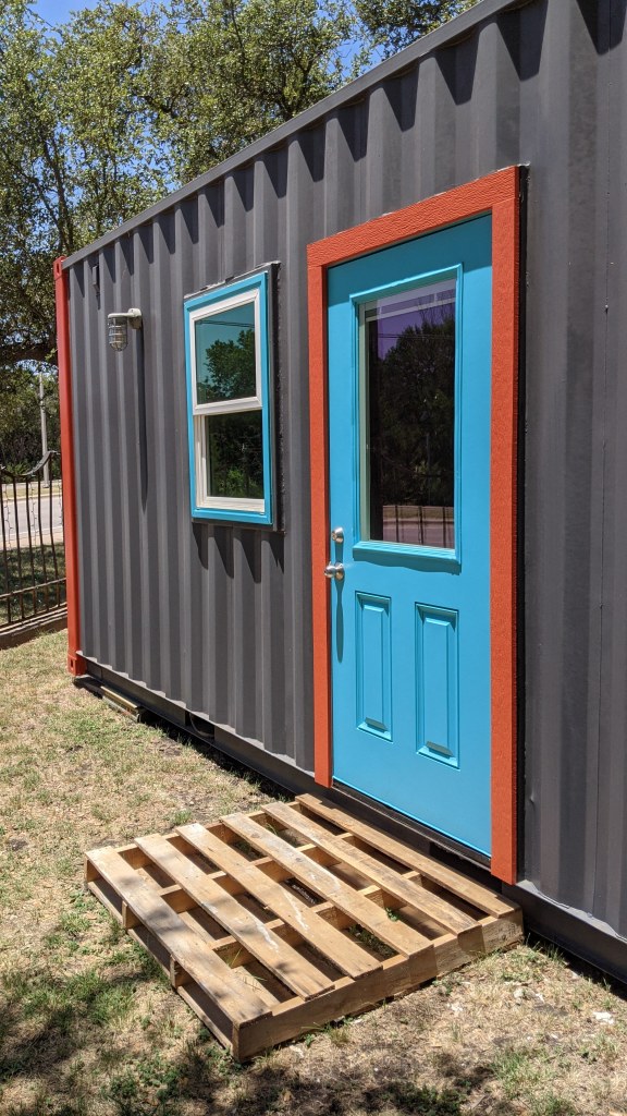 While on a visit to a friend’s BBQ Food Truck(Trailer) down in Austin we found that one of the neighbors has set up a 20 foot container tiny home. Nicely done.